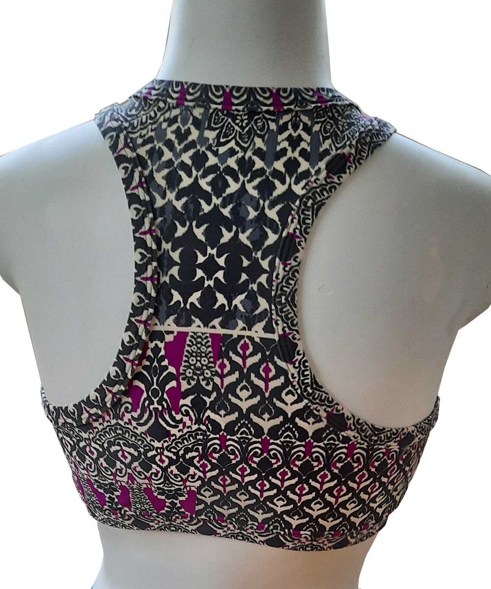 Styled in Arabesque grey print with a splash of magenta/purple tints. An assymetrical print. This hot yoga top is feminine and offers plenty of support while you sweat and stretch in it.